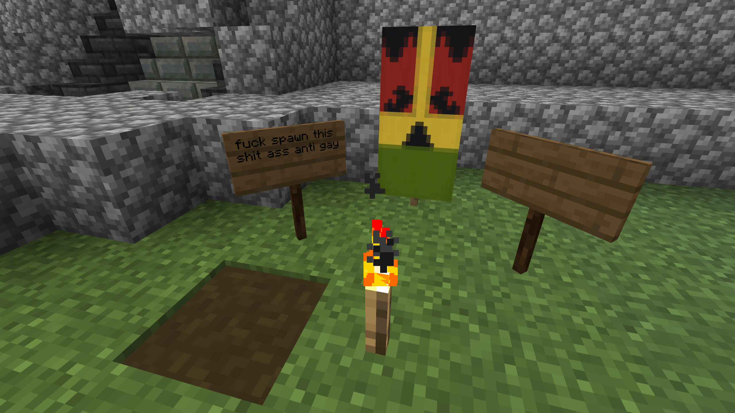 A sign left from the griefer declaring Spawn "anti gay"